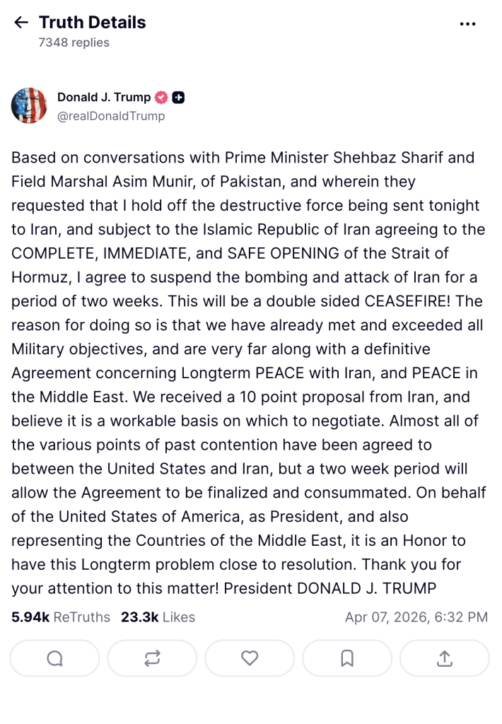 In a post shared on Truth Social, Trump called the agreement a “double sided CEASEFIRE,” adding that the United States has “met and exceeded all Military objectives.” He also disclosed that Iran presented a 10 point proposal, which he described as a “workable basis” for negotiations. According to Trump, most of the major sticking points that have defined U.S.-Iran tensions for years have already been addressed in ongoing discussions.