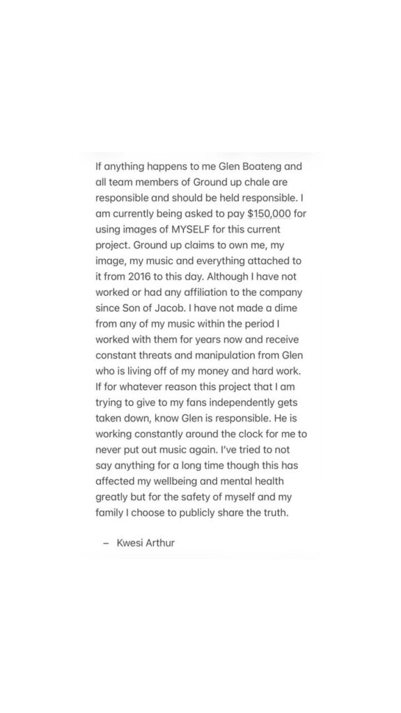 In the post, Kwesi Arthur specifically named Glen Boateng and other members of the Ground Up Chale team, stating that they should be “held responsible” if any harm comes to him.